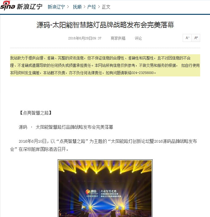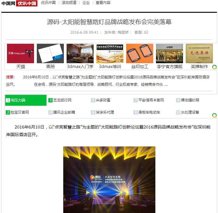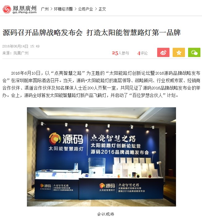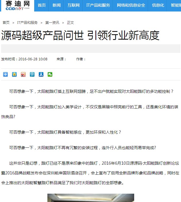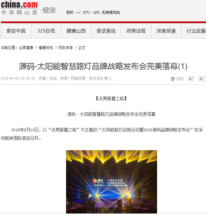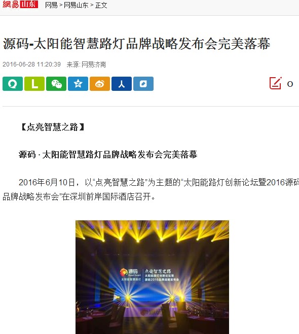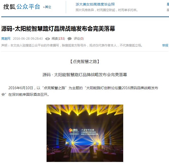 繼源碼在深圳成功舉行太陽能路燈創(chuàng)新論壇暨源碼2016品牌戰(zhàn)略發(fā)布會后,引起了各大媒體和行業(yè)的廣泛關(guān)注,行業(yè)專家柴鈺教授表示,此次源碼發(fā)布會已經(jīng)顛覆了行業(yè)對傳統(tǒng)太陽能路燈的認知,對太陽能路燈行業(yè)的發(fā)展指明了方向。在各大媒體的爭相報道下,網(wǎng)上掀起一片關(guān)于“源碼”的信息狂潮。
