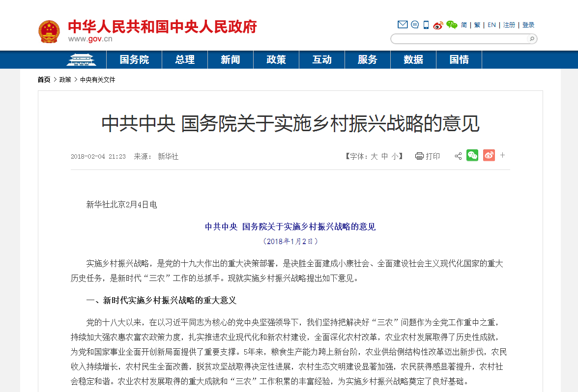 2018年1月2日,公布了2018年中央一號文件,即《中共中央國務院關于實施鄉村振興戰略的意見》 。2018年3月5日,國務院總理李克強在作政府工作報告時說,大力實施鄉村振興戰略。