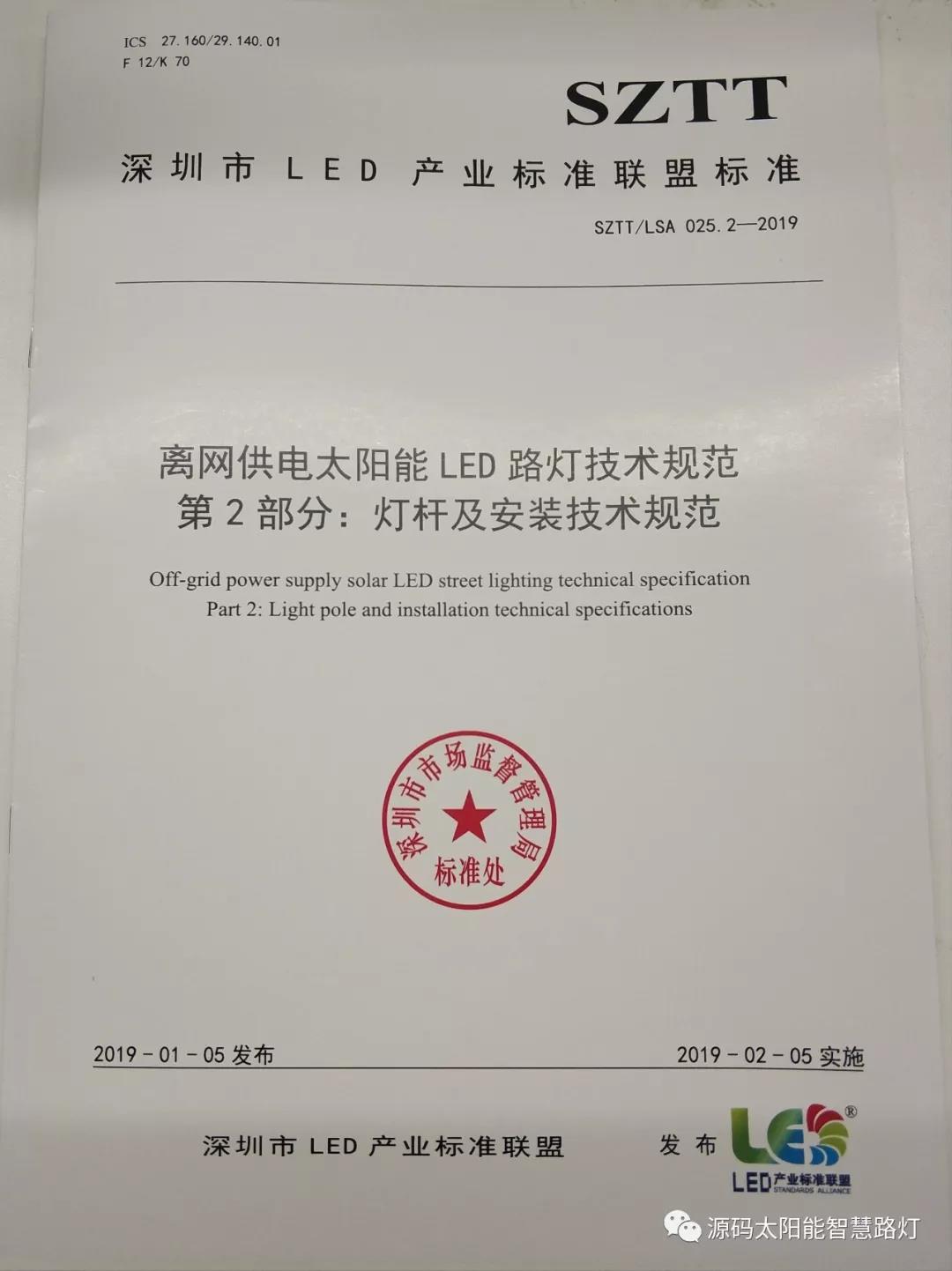 2019年1月5日,深圳市LED產(chǎn)業(yè)標準聯(lián)盟首次正式對外發(fā)布了《離網(wǎng)太陽能LED路燈技術規(guī)范》聯(lián)盟標準。《離網(wǎng)太陽能LED路燈技術規(guī)范》聯(lián)盟標準包含SZTT/LSA 025.1-2019《總規(guī)范》和SZTT/LSA 025.2-2019《燈桿及安裝技術規(guī)范》兩部分,主要由深圳源創(chuàng)智能照明有限公司、深圳市計量質量檢測研究院、深圳清華大學研究院、深圳市標準技術研究院、國家半導體光源產(chǎn)品質量監(jiān)督檢驗中心、廣東省南粵質量技術研究院等共同起草。
